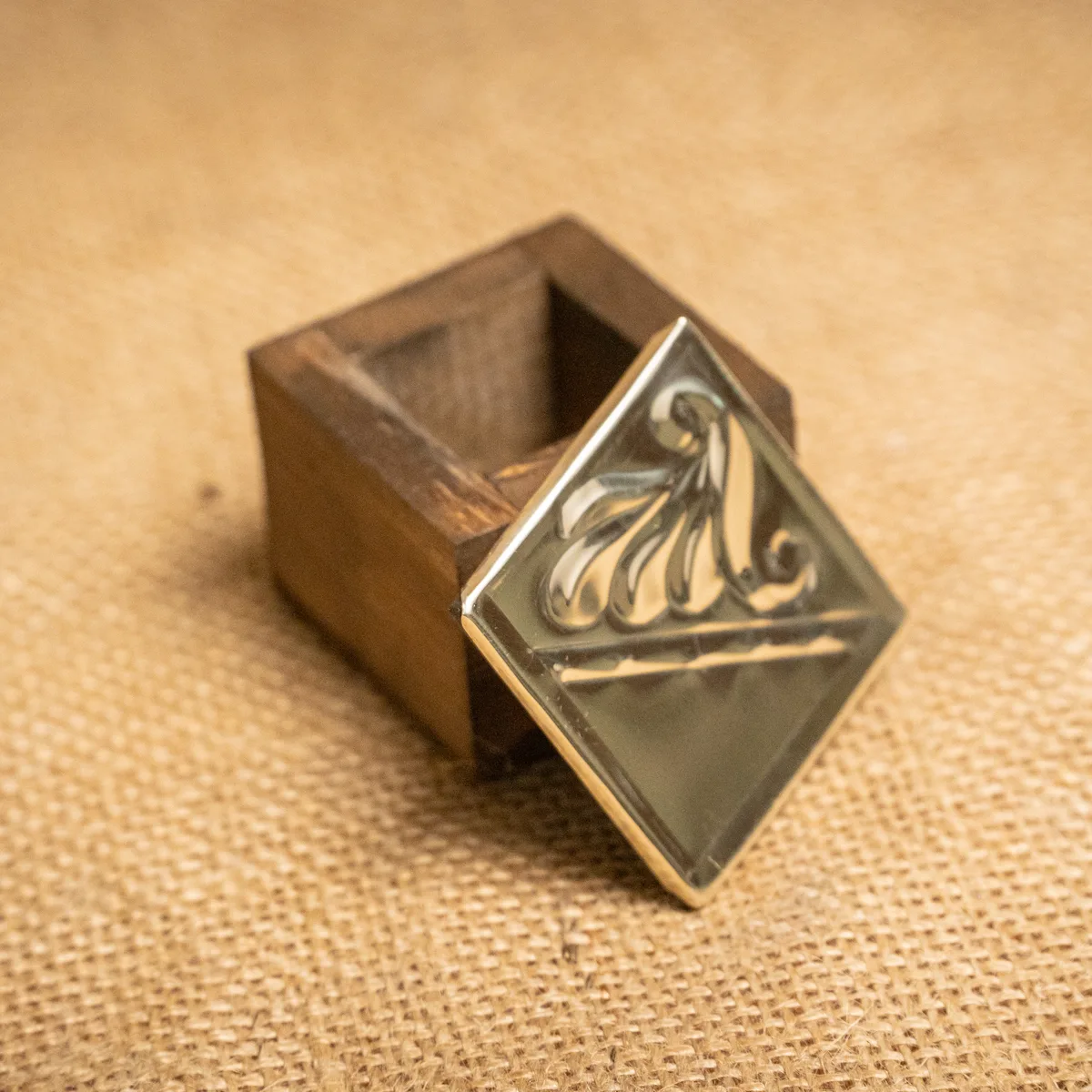 Alhajero de 5×5 cm, confeccionado con una sólida base de madera de alta calidad y una tapa de alpaca con un refinado diseño de orfebrería. Sus dimensiones cuadradas y ultracompactas lo convierten en la pieza ideal para proteger piezas de valor pequeñas, como anillos o gemelos, con total distinción. La calidez de la veta natural de la madera contrasta armoniosamente con el brillo y la durabilidad del metal trabajado a mano. Al ser un producto artesanal, los detalles del labrado presentan variaciones únicas que aseguran la exclusividad de cada ejemplar. Es un objeto sofisticado y funcional, pensado para quienes buscan un detalle de platería tradicional en un formato mínimo. Si el producto no cumple con tus expectativas, podés realizar el cambio por cualquier otro artículo.