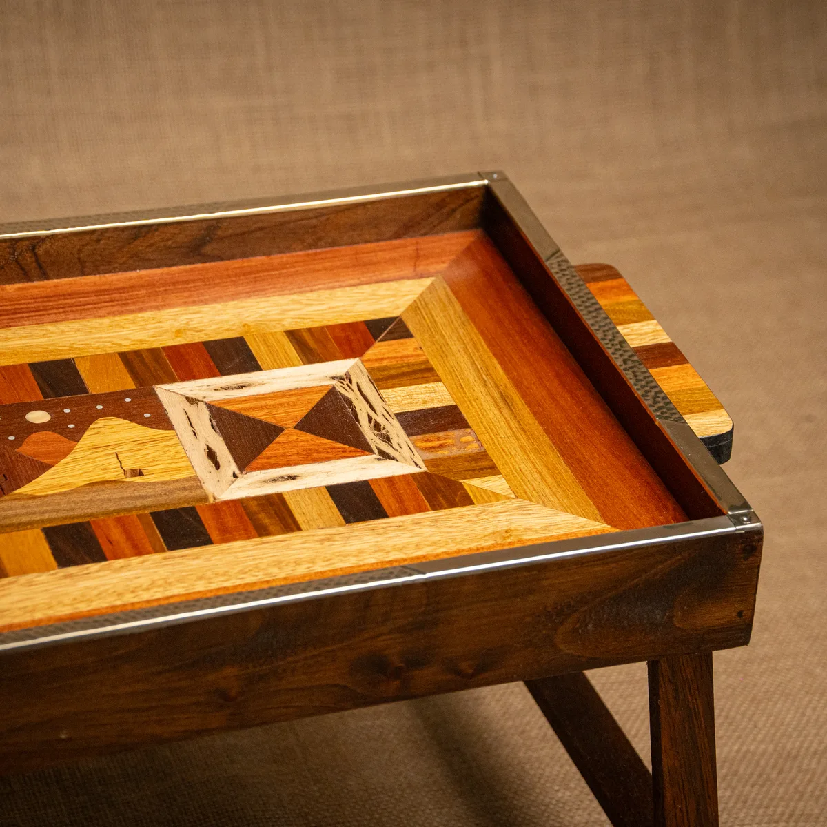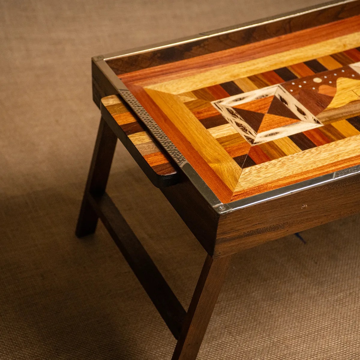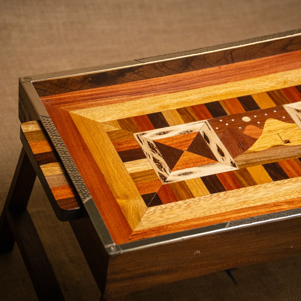 Bandeja desayunador de 60×30 cm, confeccionada con un exquisito trabajo de incrustaciones en maderas de cardón y guayubira. Su diseño resalta el contraste natural de las vetas, combinando la textura rústica del cardón con la elegancia tonal de la guayubira en una superficie amplia y resistente. El borde íntegramente en alpaca aporta un acabado de alta orfebrería que realza la pieza, brindando durabilidad y un brillo distintivo. Al ser un producto terminado a mano, cada bandeja es única, reflejando la autenticidad de los materiales nobles utilizados. Es un objeto de gran categoría, ideal para servir desayunos con distinción o como pieza decorativa central en ambientes sofisticados. Si el producto no cumple con tus expectativas, podés realizar el cambio por cualquier otro artículo.