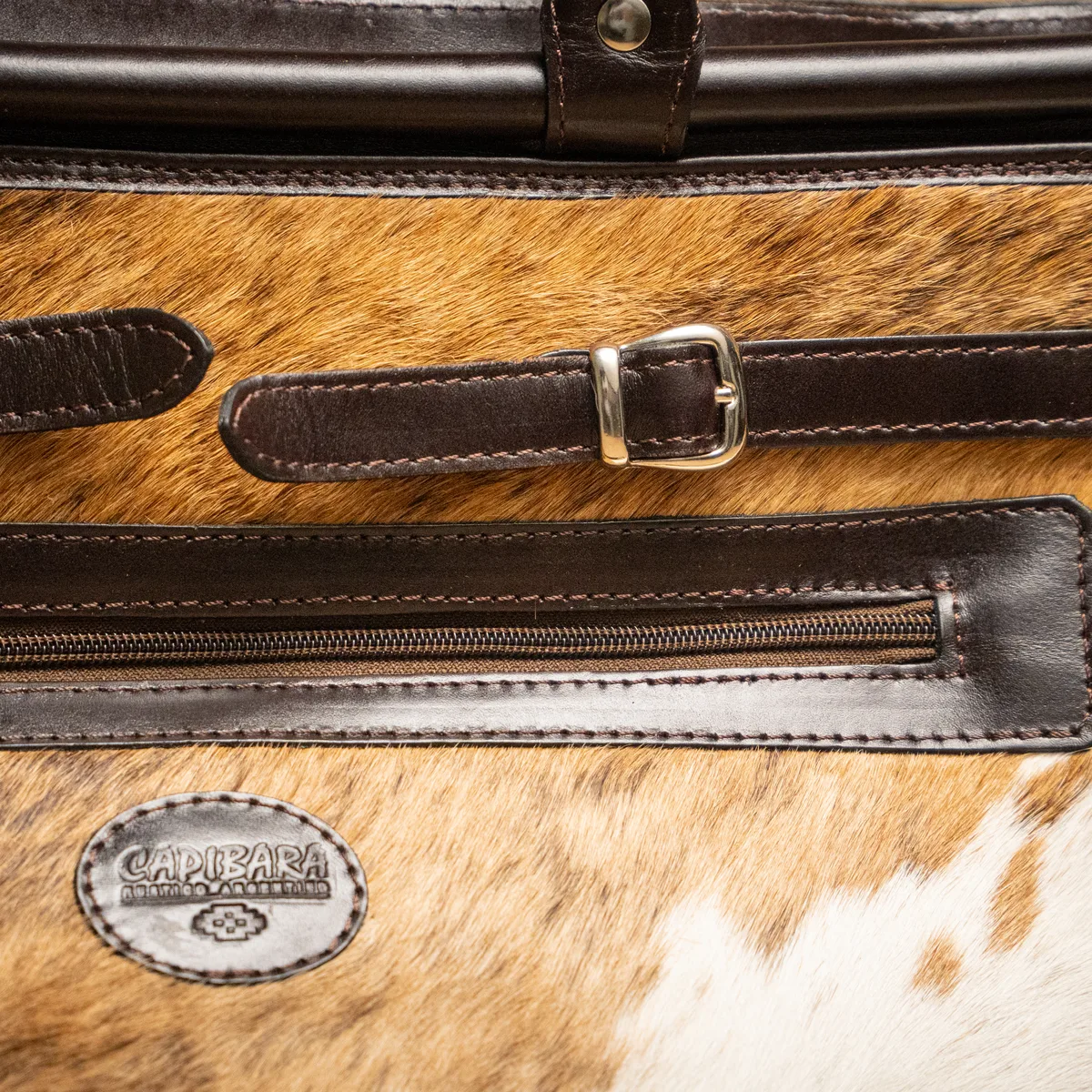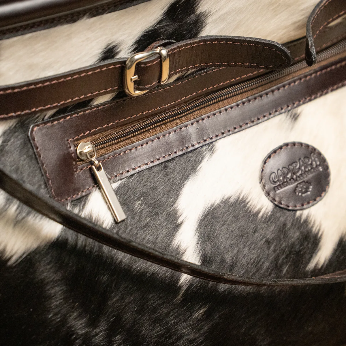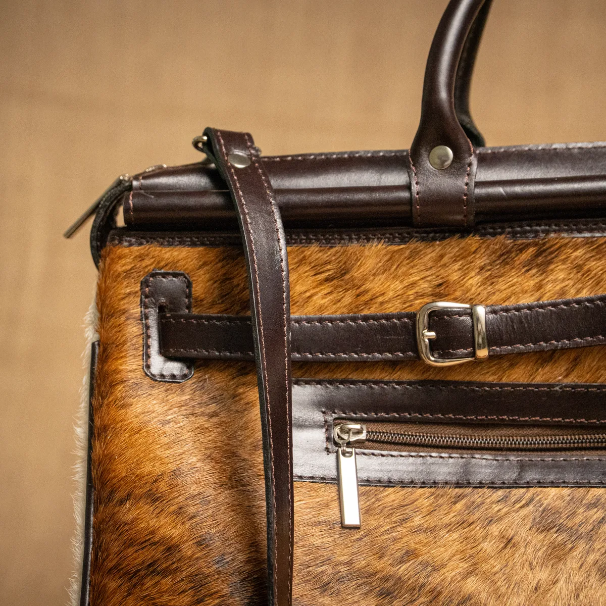 Bolso Hermes. El Bolso Hermes combina diseño y funcionalidad en una pieza pensada para acompañarte en distintos momentos, con amplio espacio y comodidad para llevar todo lo que necesitás. Está confeccionado en cuero de vaca y pelo, reconocido por su resistencia, textura única y durabilidad, cuenta con un bolsillo externo para acceder fácilmente a lo esencial y dos compartimientos internos que brindan mayor organización y espacio para guardado. Incluye correa larga para llevarlo cruzado o al hombro y correas al hombro que permiten un agarre cómodo para el uso diario. Medidas: bolso 30 cm alto x 50 cm ancho x 26 cm fuelle, correa larga de 120 cm y correas al hombro de 15 cm. Puede presentar variaciones de tono y textura respecto a la foto, propias del cuero natural. Si no te gusta, podés cambiarlo por otro producto.