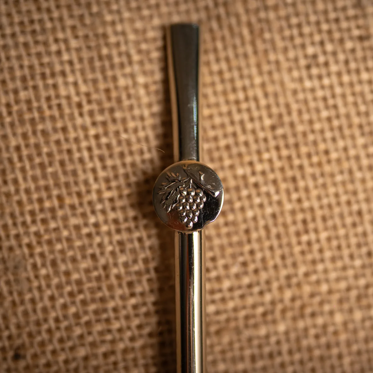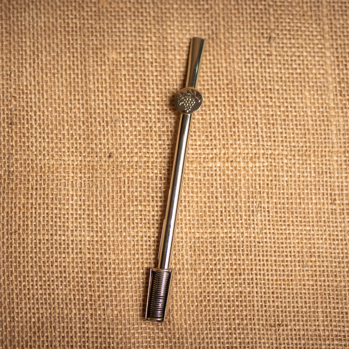 Bombilla con Aplique de Racimo. Esta bombilla es una verdadera pieza de orfebrería, diseñada para quienes buscan un detalle de distinción en su ritual diario del mate. Está íntegramente fabricada en alpaca de primera calidad, un material noble que asegura durabilidad y una excelente higiene al no alterar los sabores. Con un largo total de 15 cm, presenta un diseño de caño liso que se ve jerarquizado por un aplique artesanal con motivo de racimo en relieve, aportando un toque tradicional y elegante. En su base, cuenta con un filtro de resorte de alta eficiencia que garantiza una succión limpia y fluida. Al ser una pieza con terminaciones manuales, los detalles del aplique pueden presentar variaciones naturales que realzan su valor artesanal.