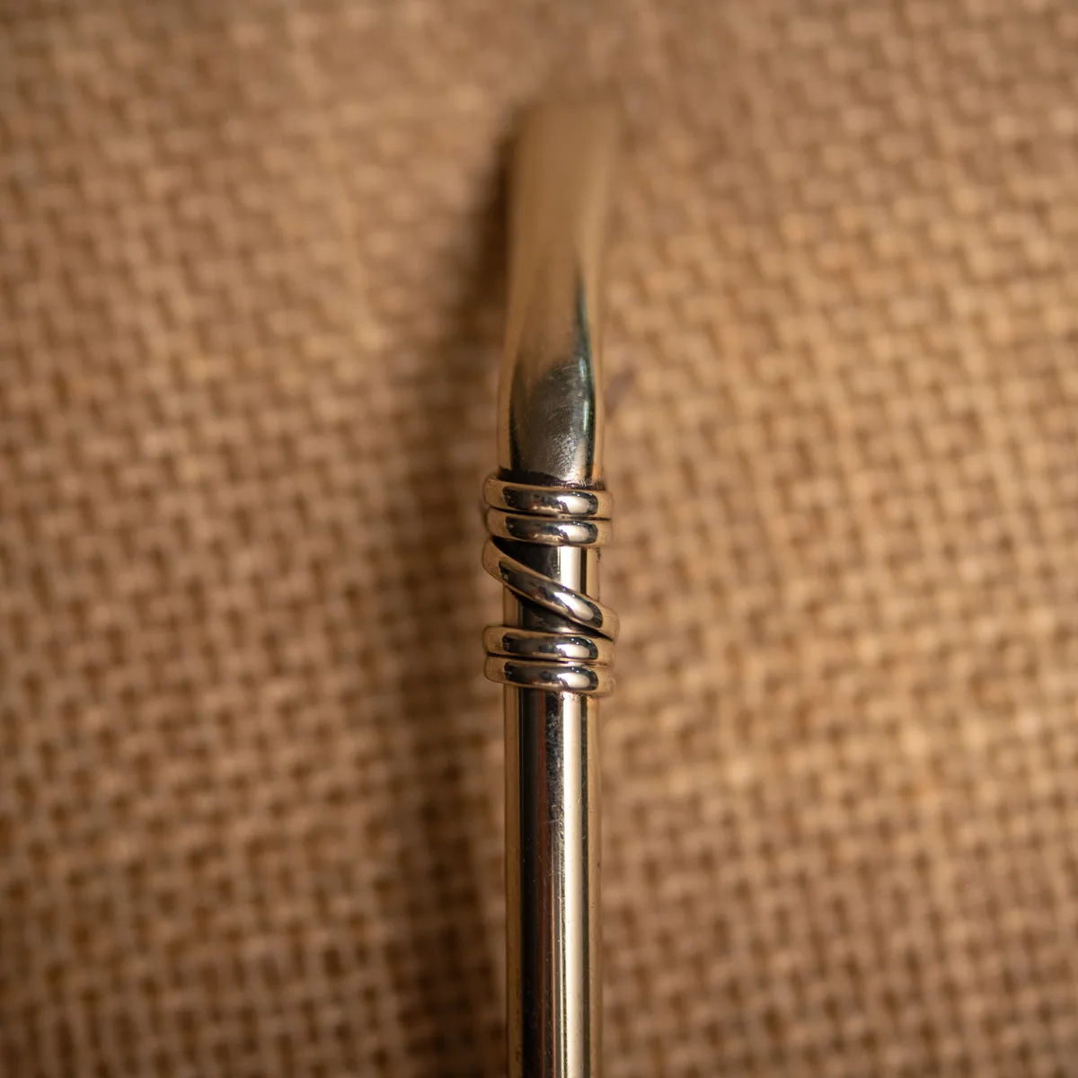 Bombilla de Alpaca Torcida con Soga. Esta pieza de orfebrería destaca por su diseño ergonómico y un detallado trabajo artesanal que la convierte en un accesorio distintivo para cualquier equipo matero. Está fabricada íntegramente en alpaca de alta calidad, garantizando durabilidad y una excelente higiene al no transmitir sabores metálicos a la infusión. Su estructura de 15 cm de largo presenta un diseño «torcido» con una curvatura ideal para una postura cómoda al beber, jerarquizada por un aplique decorativo en relieve que simula un tejido de soga de alpaca en la parte superior del caño. En su base, cuenta con un filtro de resorte reforzado que asegura una succión fluida y constante, evitando el paso de la yerba y facilitando la limpieza del instrumento. Al ser un producto con terminaciones manuales, los detalles del relieve en soga pueden presentar ligeras variaciones que realzan su carácter auténtico y artesanal. Esta bombilla es la elección ideal para quienes buscan ergonomía con un toque de diseño tradicional; para consultar otros modelos de alpaca, no dudes en contactarnos. Si la pieza no cumple con tus expectativas, podés realizar el cambio por cualquier otro artículo de nuestra línea.
