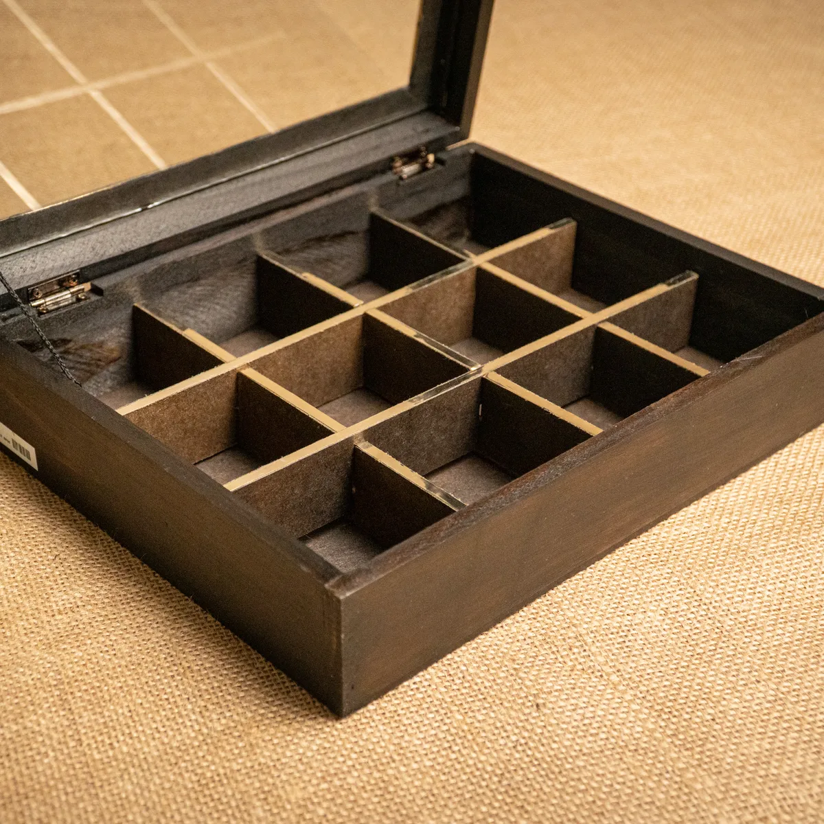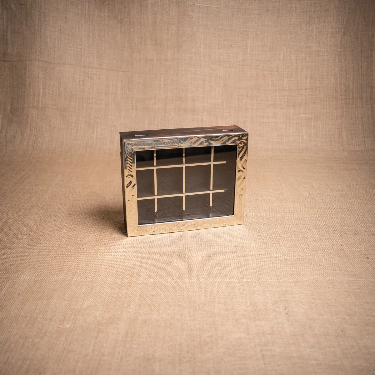 CAJA DE TÉ BASE DE MADERA Y TAPA DE ALPACA DE 12 DIVISIONES
