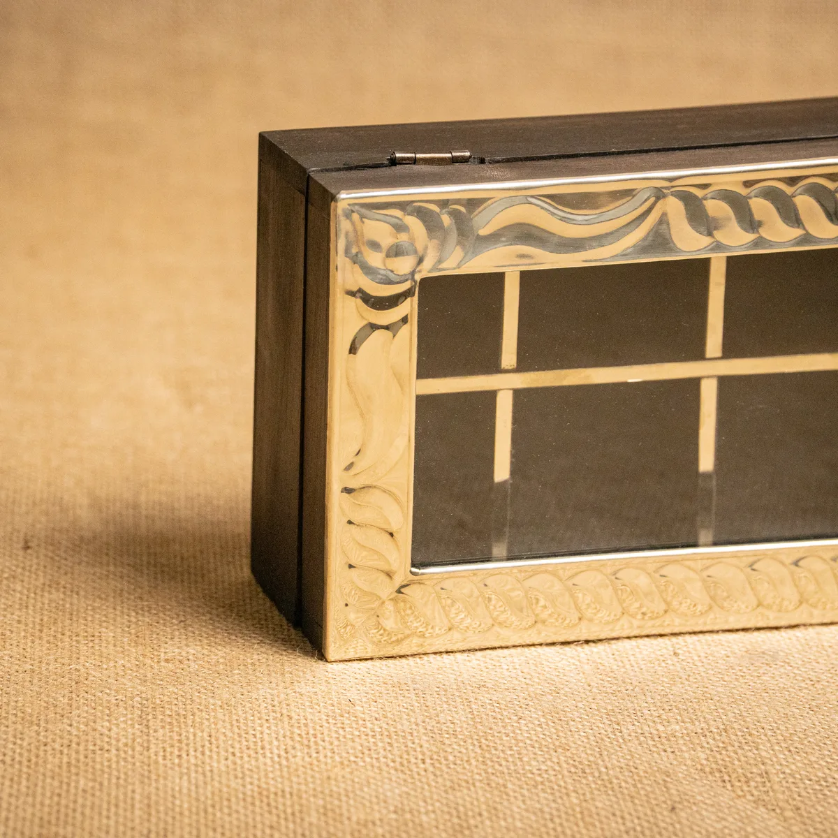 CAJA DE TÉ BASE DE MADERA Y TAPA DE ALPACA DE 8 DIVISIONES