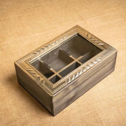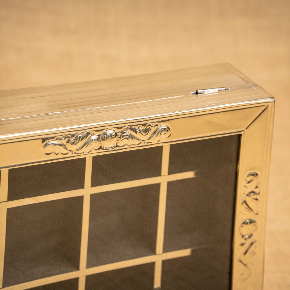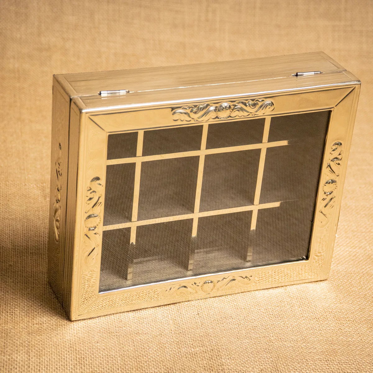 Caja de té artesanal de 12 divisiones, confeccionada íntegramente en alpaca de alta calidad con un minucioso trabajo de orfebrería manual. Sus amplias dimensiones de 30x24x8 cm permiten organizar una extensa variedad de hebras o saquitos, manteniendo el orden con un estilo sofisticado y profesional. El brillo natural del metal y la complejidad de sus grabados resaltan en cada superficie, convirtiéndola en una pieza de lujo ideal para destacar en cualquier ambiente. Al ser un trabajo realizado a mano, los motivos del labrado presentan variaciones únicas que garantizan la exclusividad de cada ejemplar. Es un objeto robusto y de gran categoría, pensado para quienes valoran la platería tradicional en piezas funcionales de gran escala. Si el producto no cumple con tus expectativas, podés realizar el cambio por cualquier otro artículo.