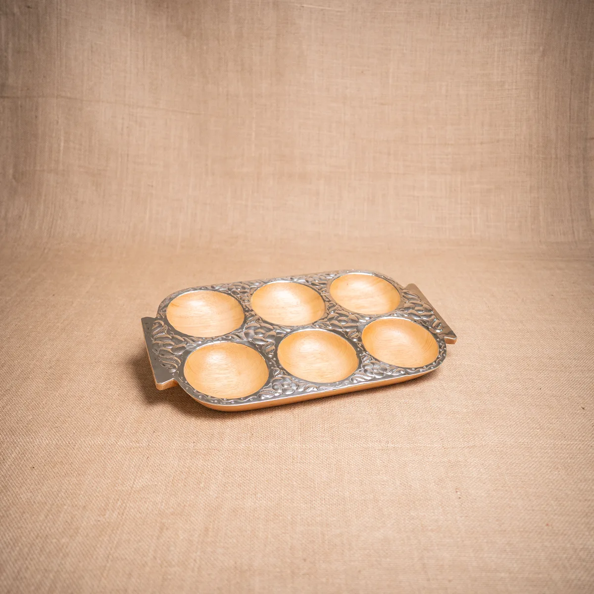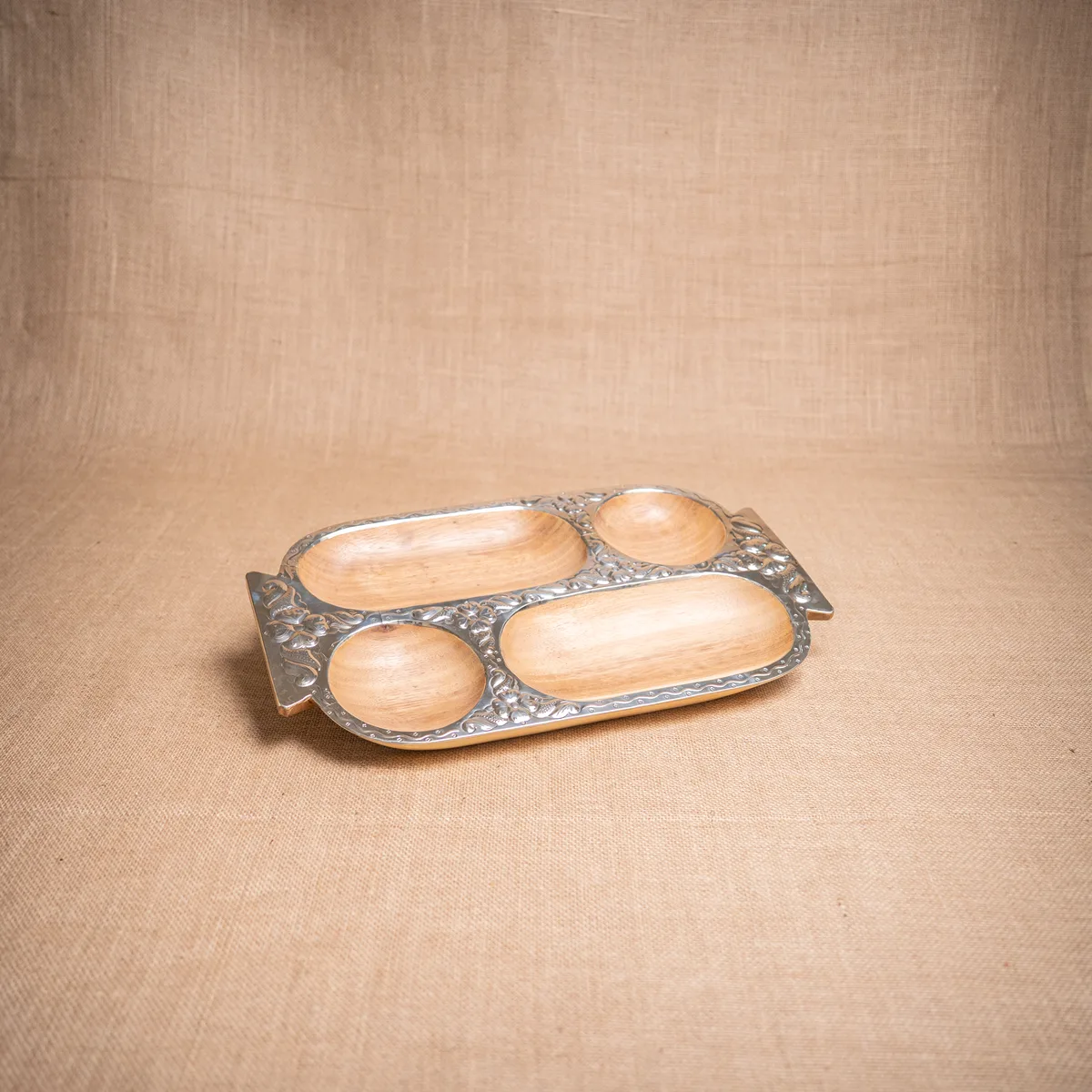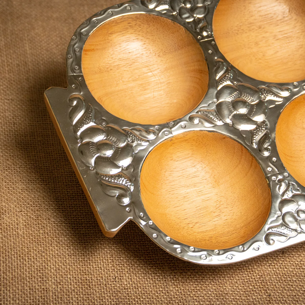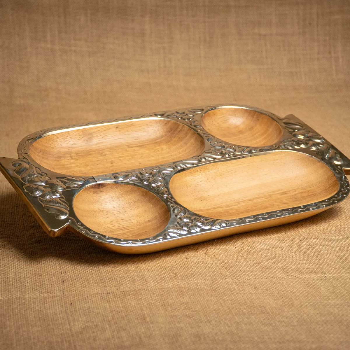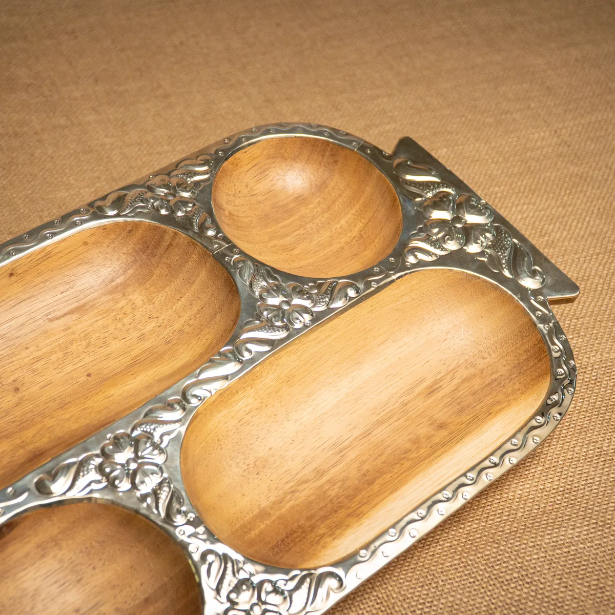 Copetinera con divisiones, confeccionada en madera de pacará de alta calidad y detalles en alpaca cincelada que aportan un brillo sofisticado. Sus medidas de 35×28 cm ofrecen una superficie amplia y organizada, ideal para presentar una variedad de snacks o copetines con total distinción en cualquier reunión. La estructura de pacará destaca por ser liviana y resistente al agua, combinando la calidez de la veta natural con la elegancia de la orfebrería artesanal. Al ser una pieza terminada a mano, los motivos del cincelado y las tonalidades de la madera presentan variaciones únicas que aseguran la exclusividad de cada ejemplar. Es un objeto funcional y de gran categoría, pensado para quienes buscan un estilo regional refinado en su mesa. Si el producto no cumple con tus expectativas, podés realizar el cambio por cualquier otro artículo.