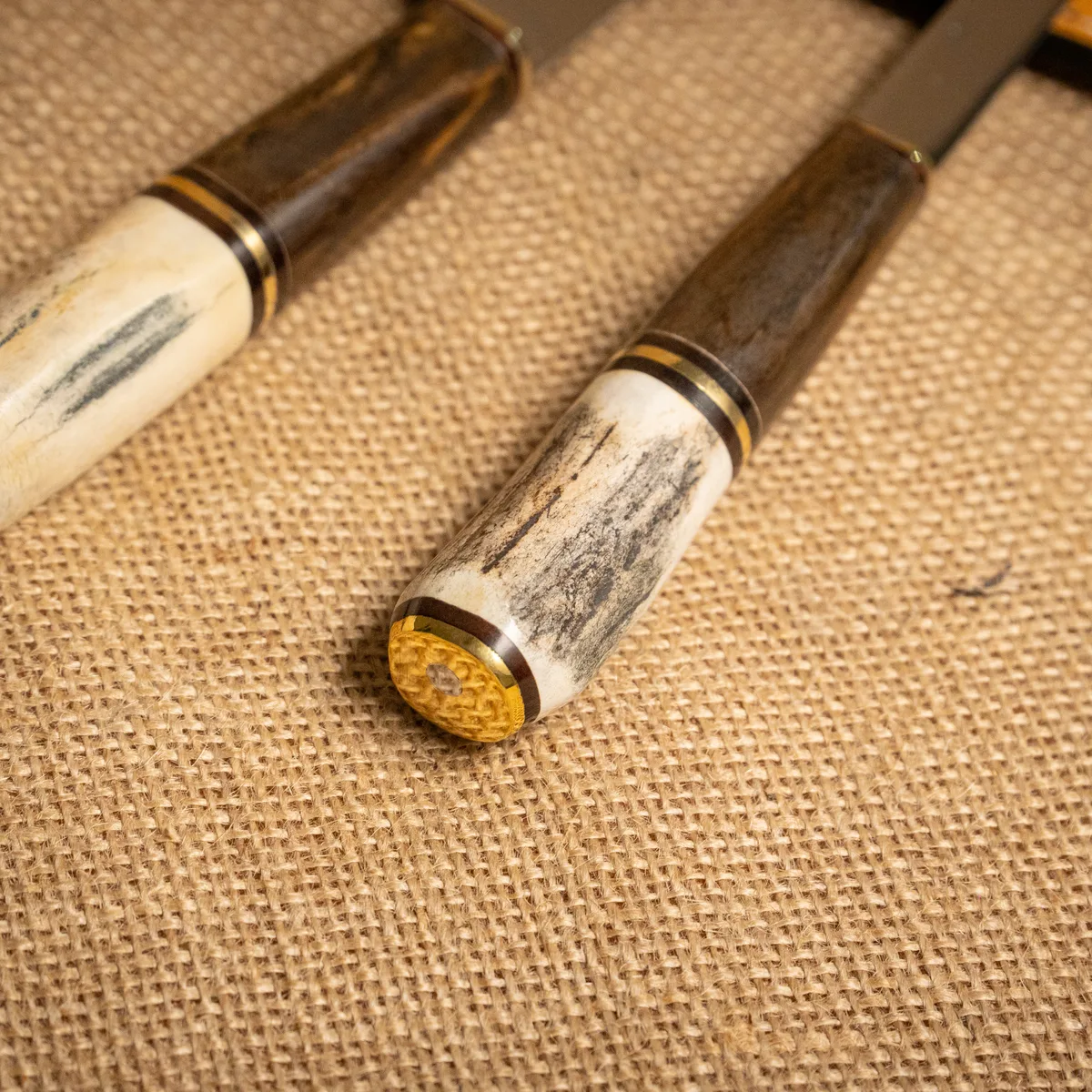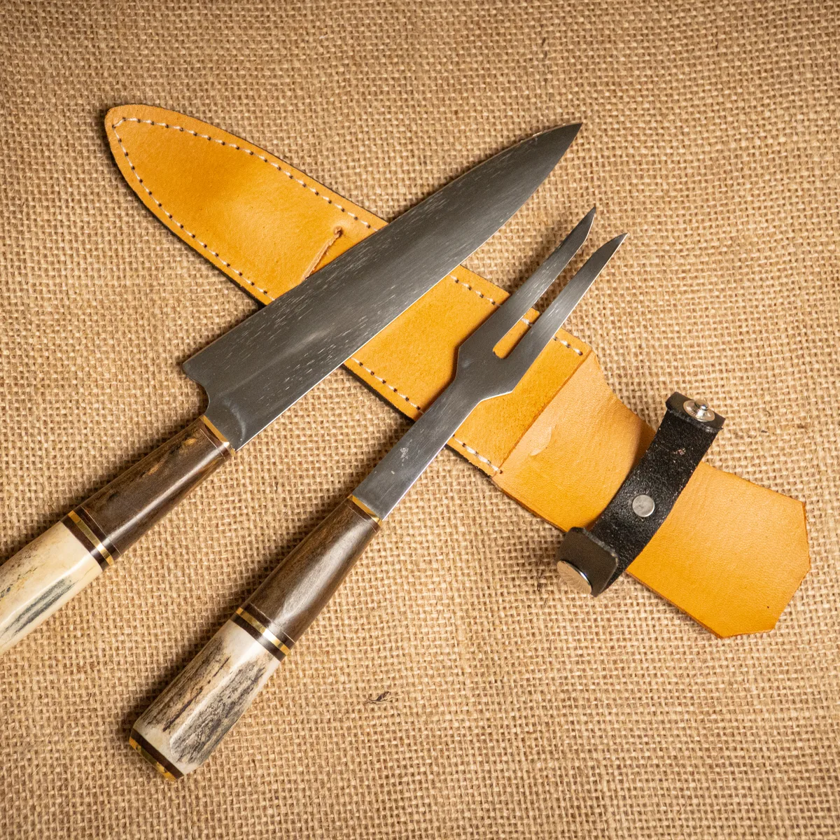 Juego de Cuchillo y Tenedor Modelo M. La combinación perfecta de funcionalidad y elegancia para el ritual del asado. Este set cuenta con piezas de acero inoxidable 420 de 18 cm de largo de hoja, alcanzando un largo total de 30 cm. Su diseño equilibrado garantiza un corte preciso y un manejo cómodo en todo momento, convirtiéndolo en el aliado ideal para el parrillero. El conjunto se presenta con una vaina de cuero legítimo de alta calidad, diseñada para mantener ambas piezas protegidas y facilitar su transporte. Este modelo se puede personalizar con un grabado exclusivo; para realizarlo, no dudes en consultarnos. Al ser un producto artesanal, las texturas y tonos de los materiales naturales garantizan que cada juego sea único. Si no cumple con tus expectativas, podés realizar el cambio por cualquier otro artículo.