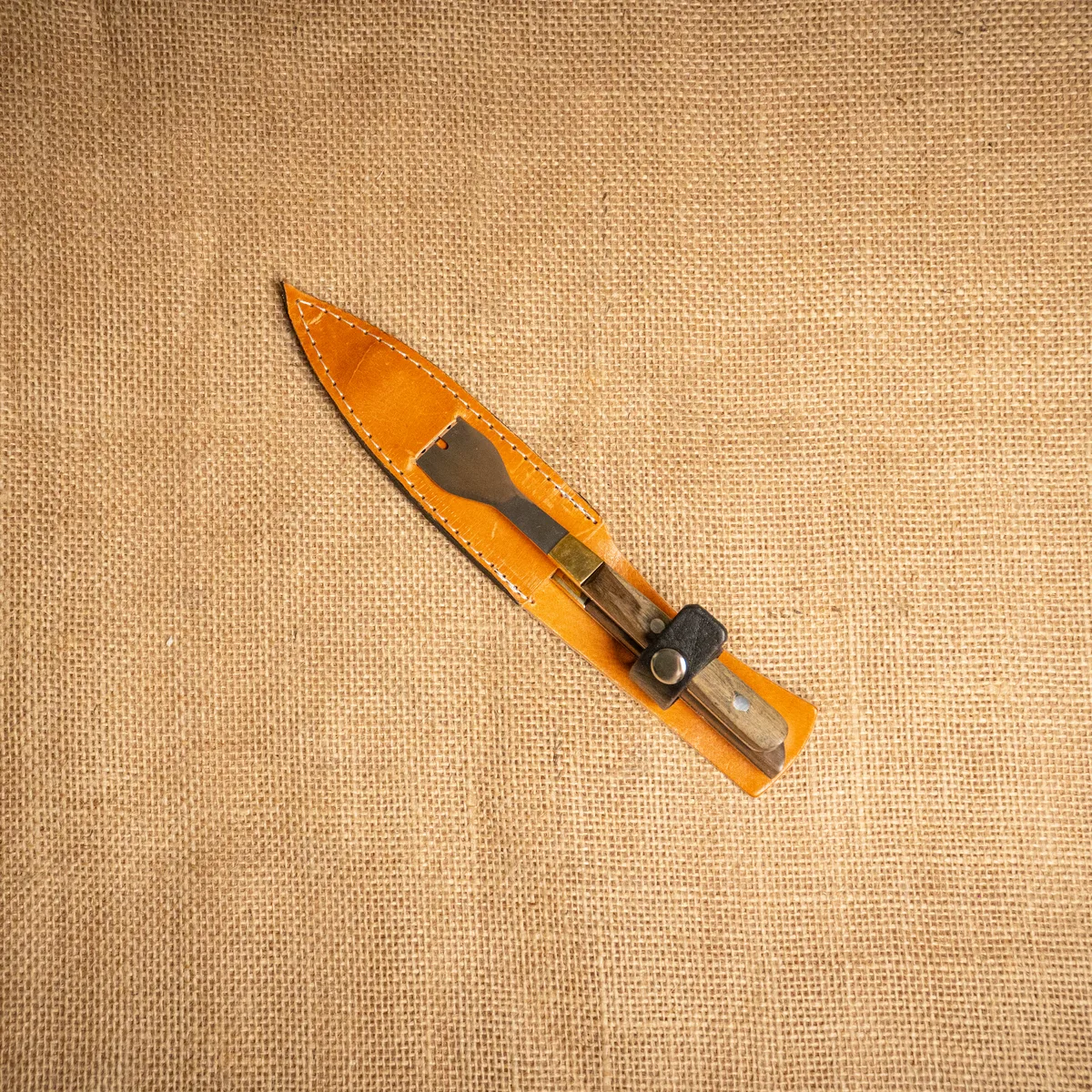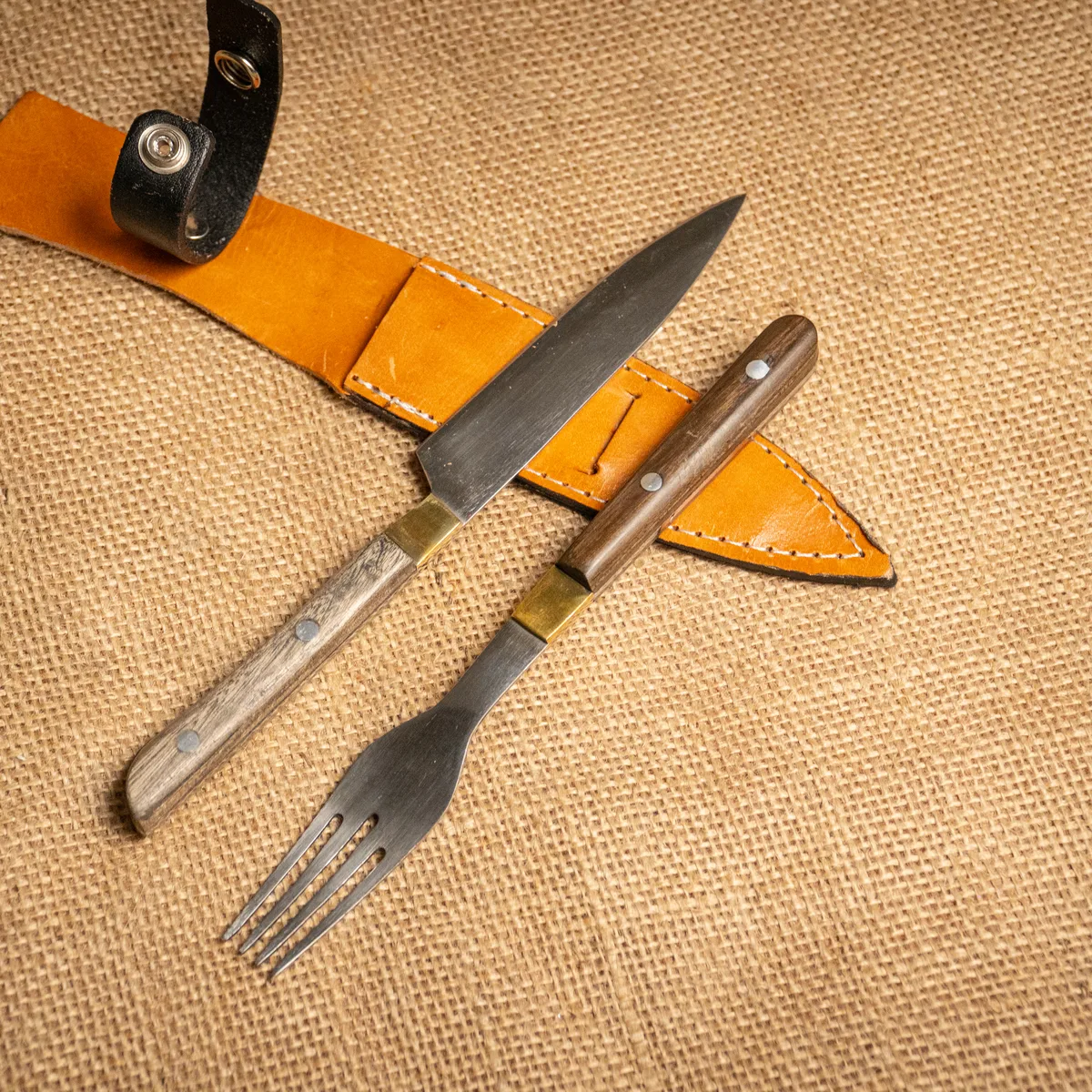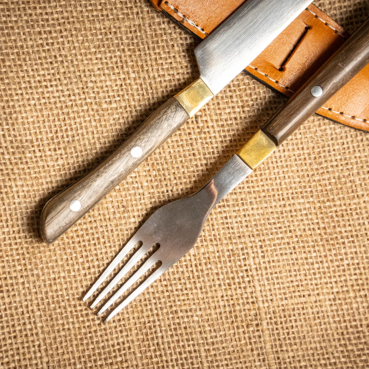 Juego de Asado Modelo N (Madera). Un set compacto y funcional, ideal para quienes buscan un equipo de asado personal ligero y tradicional. Este conjunto incluye cuchillo y tenedor con hojas de acero inoxidable de 11 cm, alcanzando un largo total de 21 cm por pieza. Con un peso de solo 150 gr, es una de nuestras opciones más ágiles y cómodas para el uso diario. Los cabos de madera seleccionada presentan un diseño clásico con remaches de bronce y virolas metálicas, ofreciendo un agarre firme y una estética sobria. Se entrega con una vaina de cuero legítimo artesanal con broche de seguridad, alcanzando un largo total de 25 cm envainado, lo que facilita su transporte y protección. Este modelo se puede personalizar con un grabado exclusivo; para realizarlo, no dudes en consultarnos. Al ser un producto artesanal de materiales naturales, el tono y la veta de la madera pueden variar, asegurando que cada juego sea una pieza única. Si no cumple con tus expectativas, podés realizar el cambio por cualquier otro artículo.