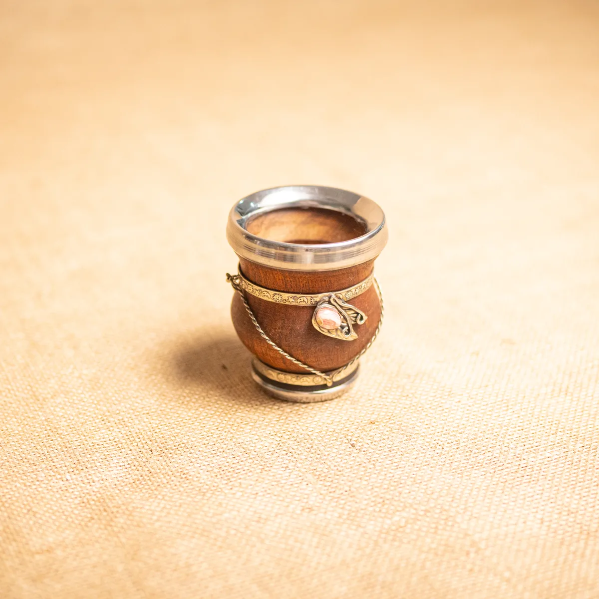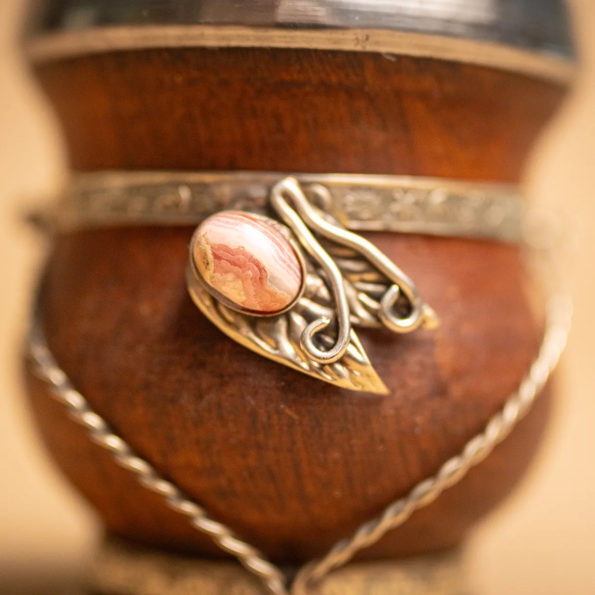 Mate de Algarrobo con Rodocrosita. Una pieza de gran valor simbólico que une la nobleza de la madera con la piedra nacional argentina. Este mate está confeccionado en madera de algarrobo seleccionada, una madera noble que destaca por su resistencia y por realzar el sabor de la yerba en cada cebada. Su diseño se distingue por una virola de alpaca trabajada y un aplique artesanal en piedra Rodocrosita, la piedra regional argentina, enmarcada en detalles de alpaca con motivos criollos. Es una pieza compacta, elegante y con un excelente equilibrio en mano. Al ser un producto artesanal de origen natural, tanto la profundidad como la tonalidad de la piedra y las vetas de la madera pueden presentar variaciones, asegurando que cada pieza sea única. Este modelo es ideal para quienes buscan un obsequio con identidad nacional o una pieza de colección; para más información, no dudes en consultarnos. Si la pieza no cumple con tus expectativas, podés realizar el cambio por cualquier otro artículo de nuestra línea.