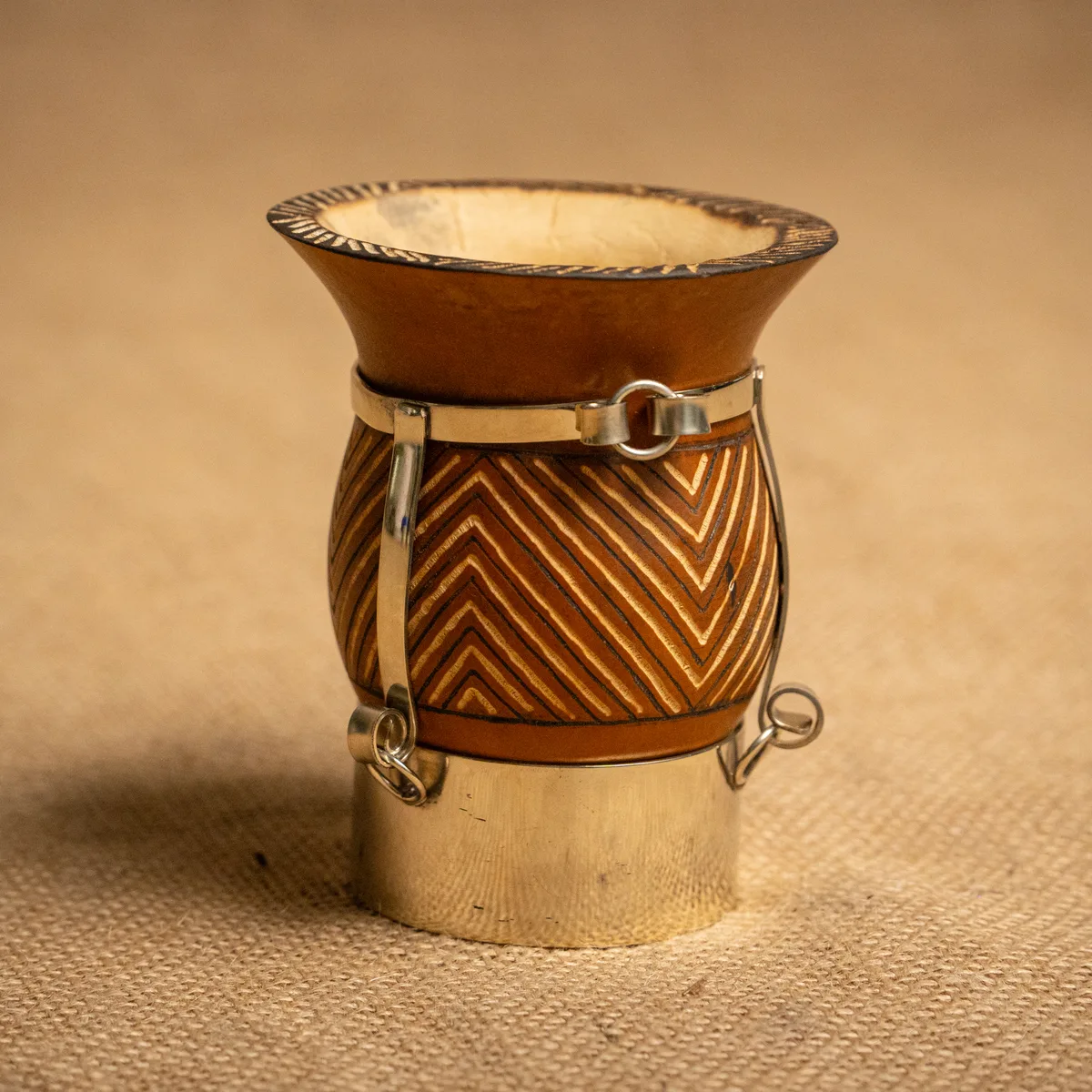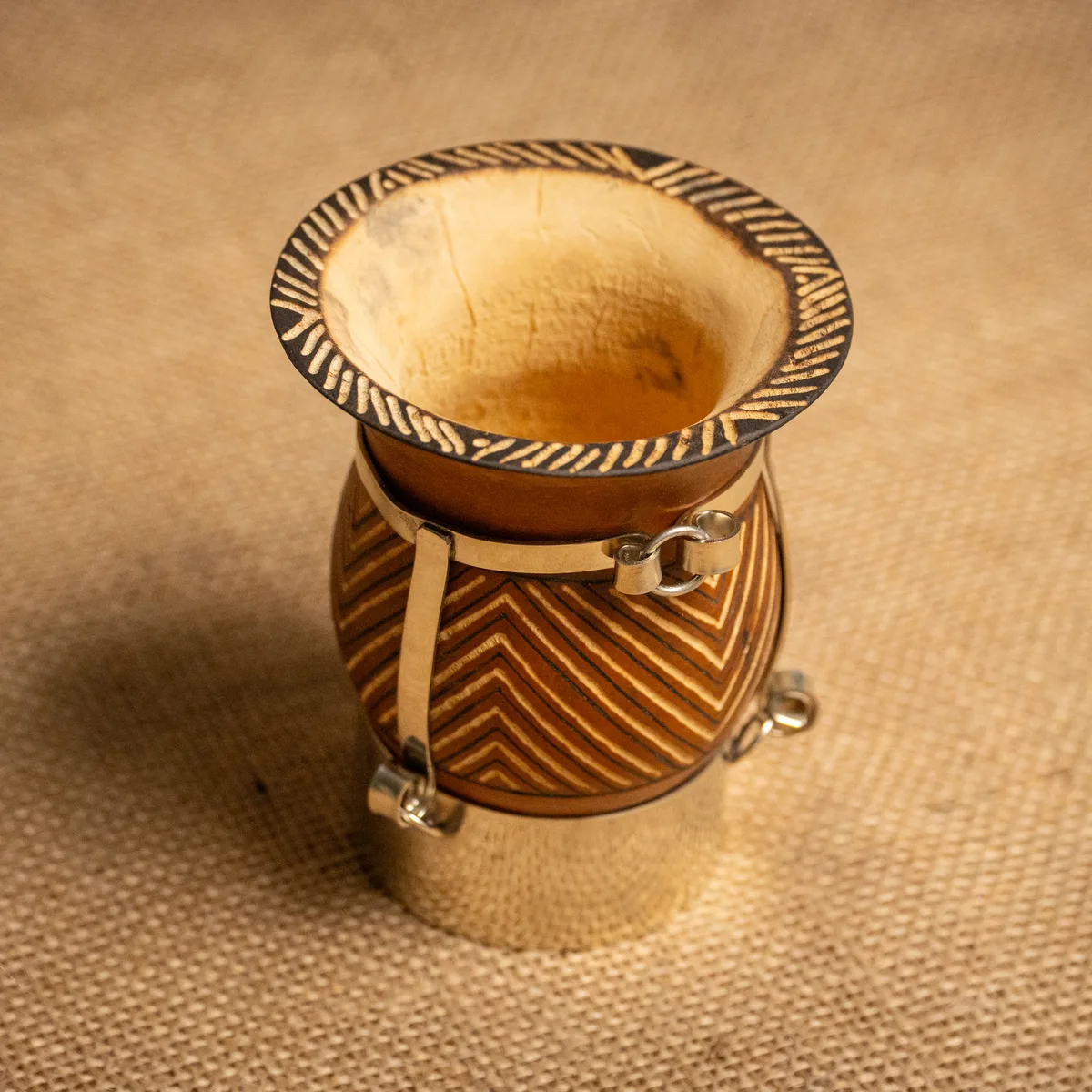 Mate de Calabaza Tallada con Alpaca. Una pieza de gran valor artesanal que combina la calidez de la naturaleza con la distinción del metal. Este mate de calabaza seleccionada destaca por su cuerpo tallado a mano con motivos geométricos, enmarcado por una base de alpaca de alta calidad, que garantizan durabilidad y un brillo perdurable. Es una pieza robusta pero cómoda de manejar. Al tratarse de un producto natural, el tamaño y la forma pueden presentar ligeras variaciones según la calabaza, lo que asegura que cada mate sea único. Este modelo se puede personalizar con un grabado exclusivo; para realizarlo, no dudes en consultarnos. Si la pieza no cumple con tus expectativas, podés realizar el cambio por cualquier otro artículo de nuestra línea.