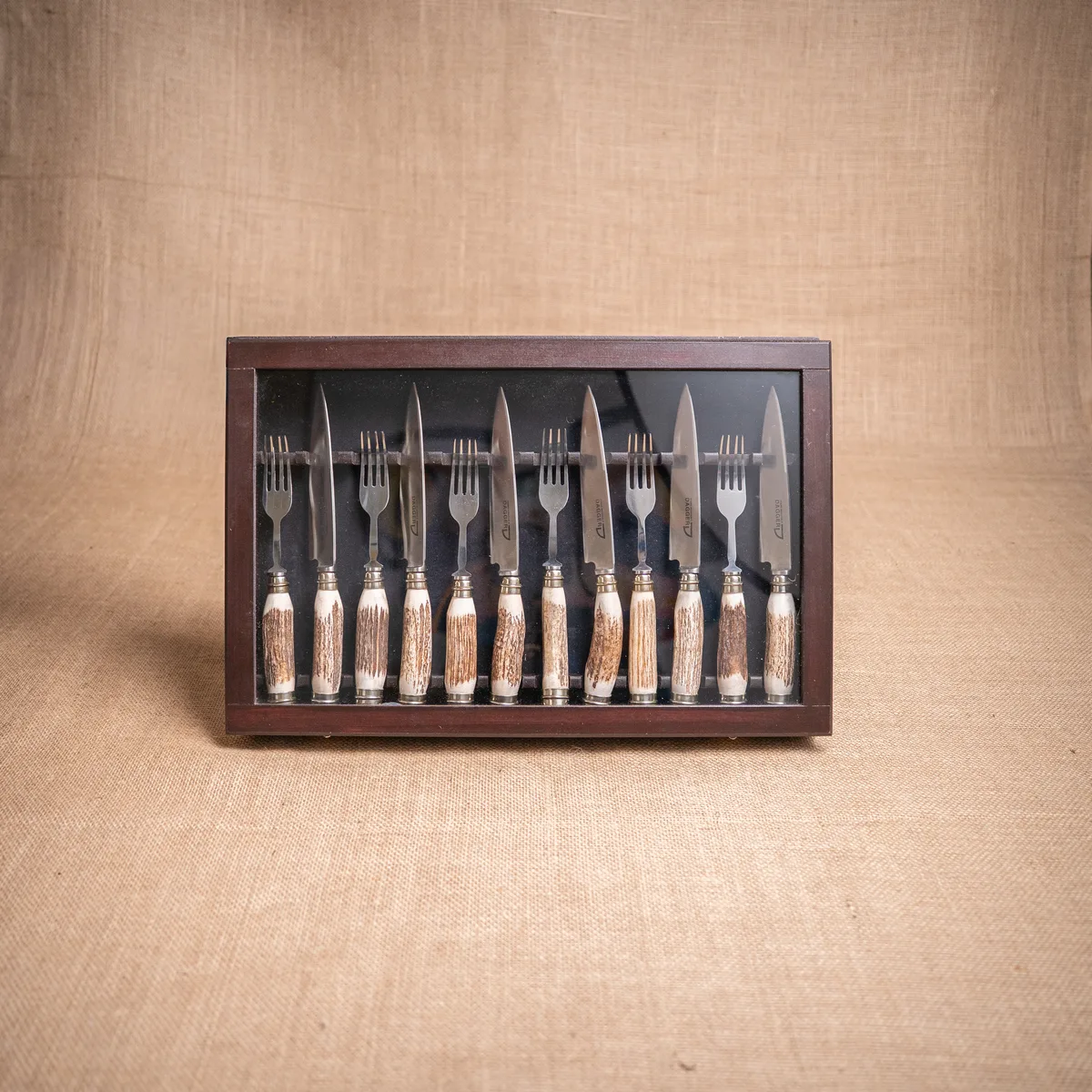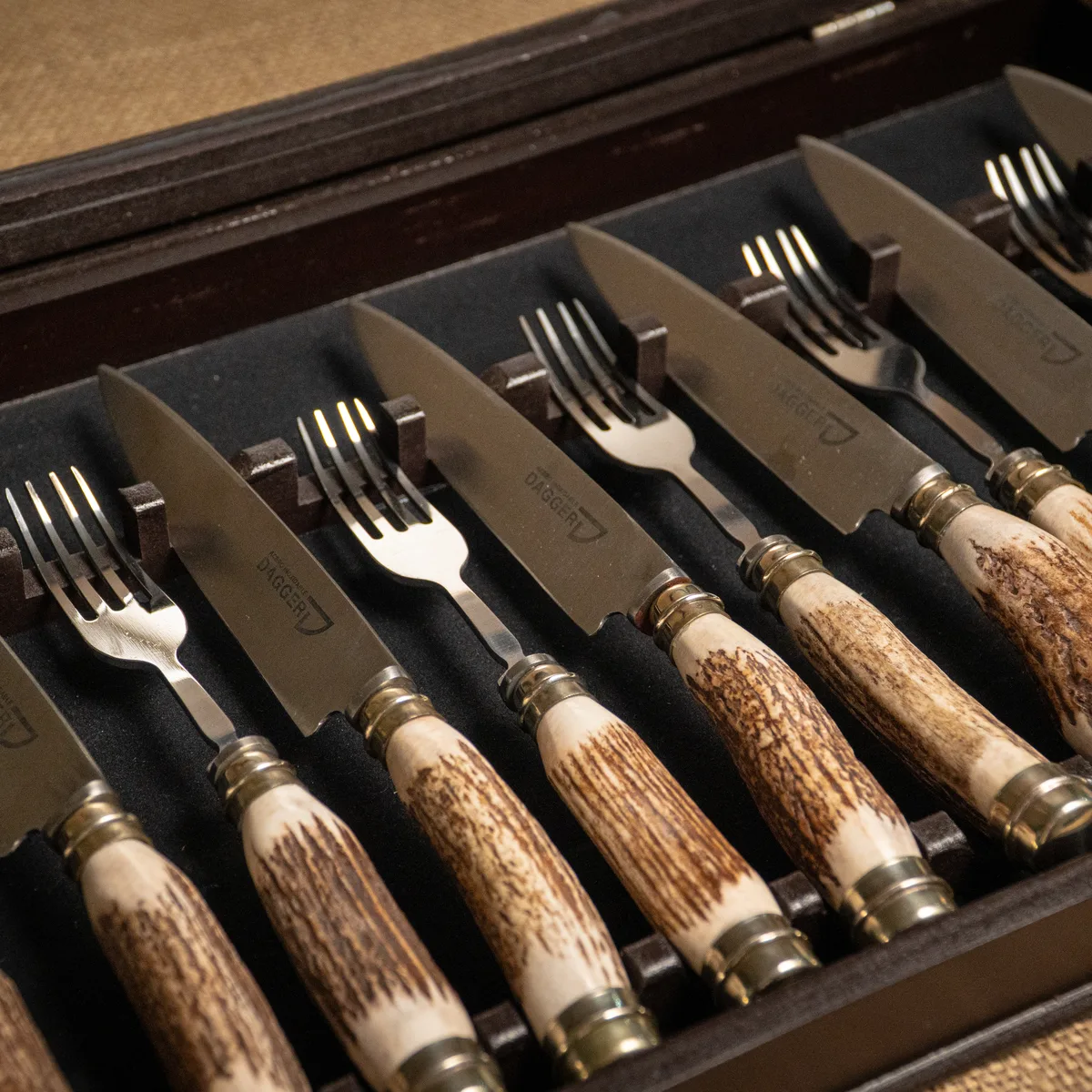 Set de 12 piezas, una combinación de máxima jerarquía compuesta por 6 cuchillos y 6 tenedores de la prestigiosa marca Dagger. Cada pieza cuenta con hojas de acero inoxidable de gran capacidad de corte y cabos de asta de ciervo natural, que brindan un agarre ergonómico y una estética rústica inigualable. El conjunto se presenta en una exclusiva caja transportable con tapa de vidrio, ideal para lucir la artesanía de los cubiertos mientras se mantienen protegidos y organizados. Al ser un producto elaborado con materiales de origen natural, las tonalidades y texturas del asta presentan variaciones únicas que aseguran la autenticidad de cada set. Es una pieza de autor diseñada para quienes buscan distinción y durabilidad en cada asado o reunión social. Si el producto no cumple con tus expectativas, podés realizar el cambio por cualquier otro artículo.