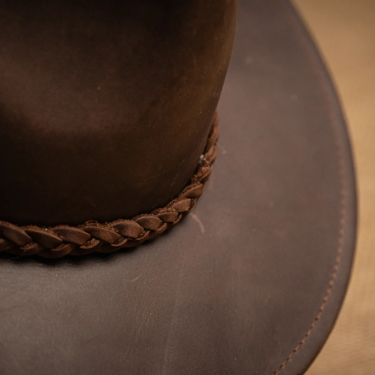 Sombrero de Cuero Engrasado. La máxima expresión de resistencia y durabilidad para el uso diario. Confeccionado en cuero vacuno engrasado, este modelo es altamente repelente al agua y cuenta con una estructura firme que gana carácter con el tiempo. El diseño se completa con una elegante cinta trenzada de cuero, realzando su estética artesanal y rústica. Ideal para quienes buscan una protección superior y un estilo robusto sin perder comodidad. Al ser un producto de origen natural, cada pieza presenta variaciones únicas que garantizan su autenticidad. Si no cumple con tus expectativas, podés realizar el cambio por cualquier otro artículo.