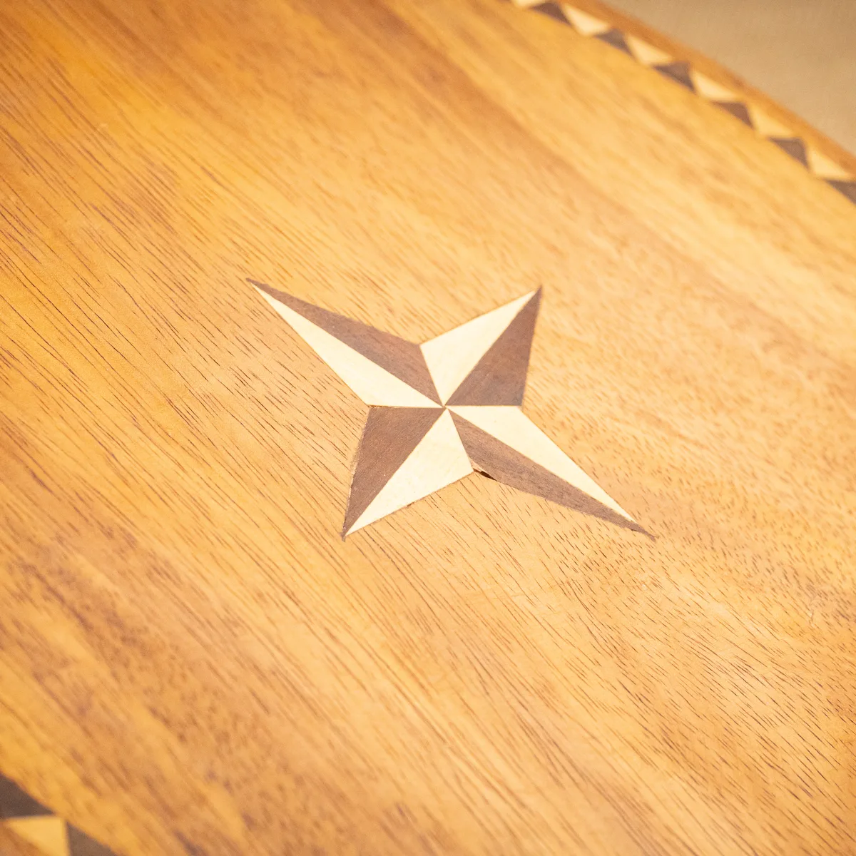 Tabla redonda de 35 cm de diámetro, confeccionada en madera de pacará de alta calidad con un sofisticado trabajo de incrustaciones en maderas varias. Su diseño central destaca por una estrella incrustada que resalta la veta natural del material, acompañada por un guarda perimetral que aporta un acabado artesanal de gran categoría. Cuenta con dos manijas reforzadas con detalles en alpaca, que combinan funcionalidad con la elegancia de la orfebrería tradicional. Es una pieza robusta y de gran presencia, ideal para servir y lucir en la mesa con un estilo regional distintivo. Al ser un producto realizado a mano, cada tabla posee tonalidades únicas que garantizan su exclusividad y durabilidad. Si el producto no cumple con tus expectativas, podés realizar el cambio por cualquier otro artículo.