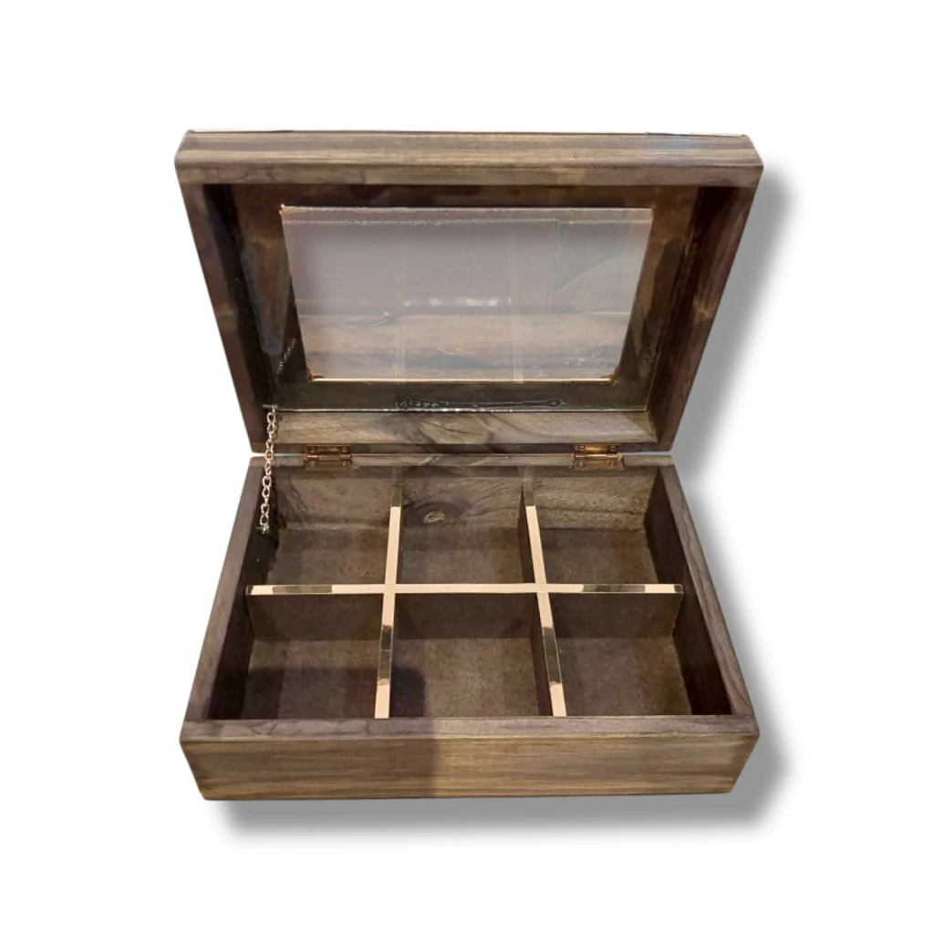 ✨ Características principales: - Tapa de vidrio transparente que conserva la frescura y permite exhibir tus tés favoritos. - Ocho divisiones internas ideales para organizar distintas variedades y mantenerlas accesibles. - Acabado artesanal que asegura la exclusividad y calidad en cada pieza.